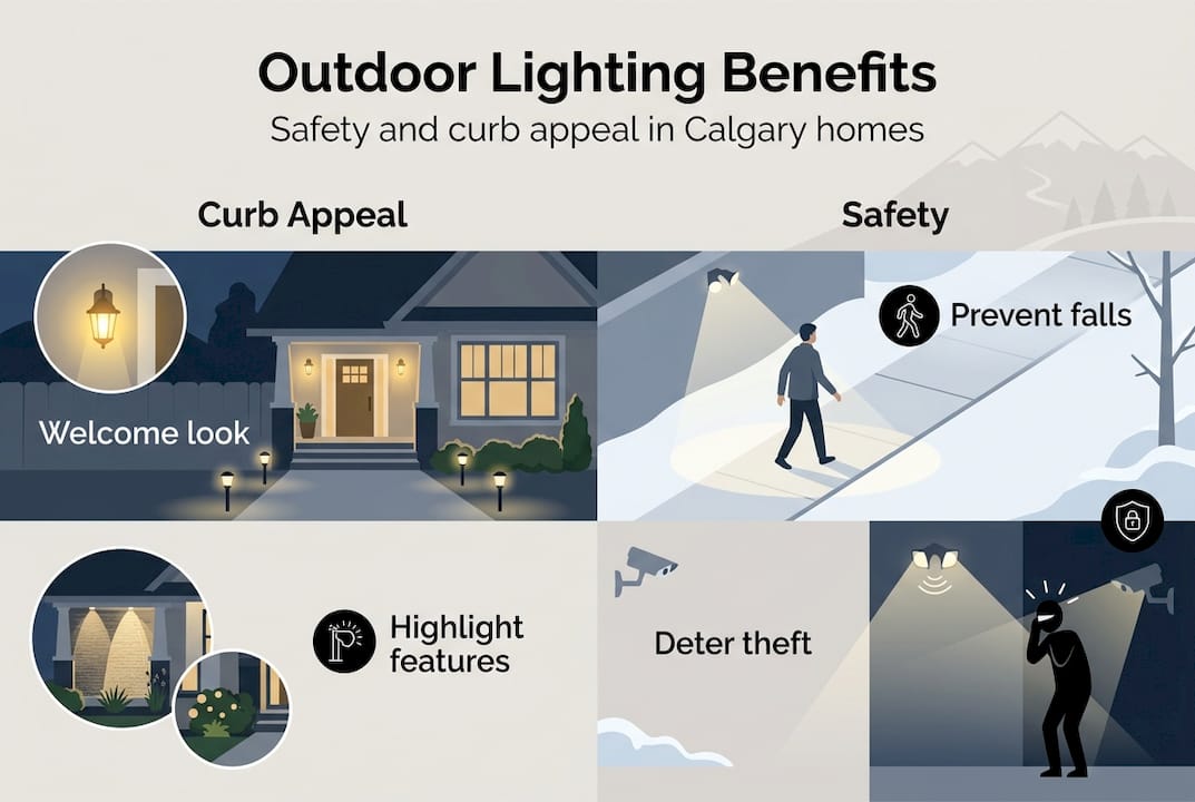 The benefits stack up quickly when you think about Calgary's long, dark winters. From October through March, your home is in darkness for the majority of evening hours. That makes outdoor lighting less of a luxury and more of a practical necessity.