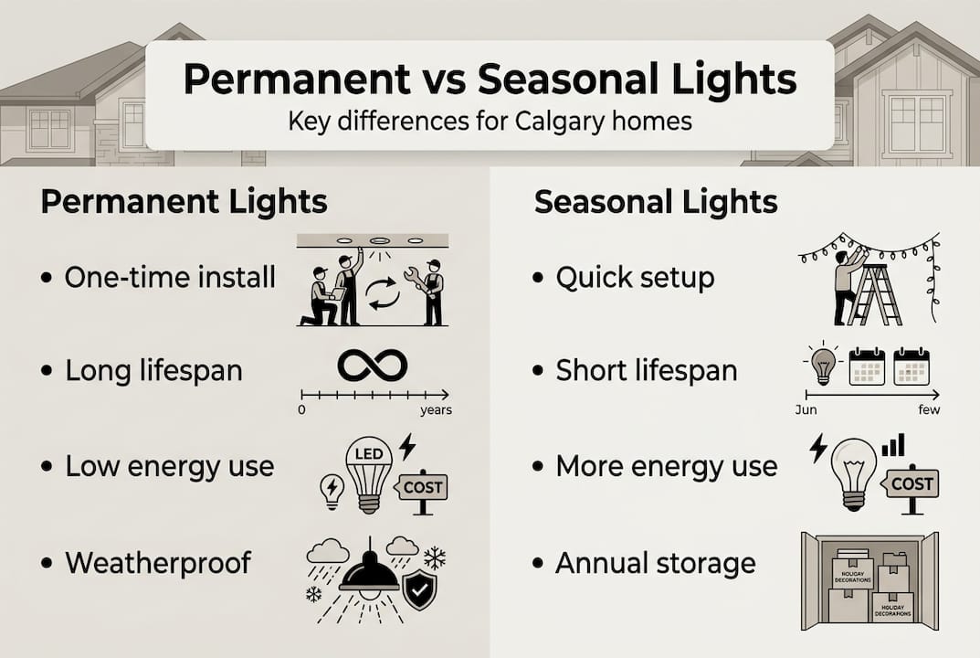 Choosing exterior lighting for your Calgary home often feels like a tug-of-war between convenience and cost. Permanent lighting promises year-round curb appeal and zero annual hassle, but comes with a hefty upfront price tag. Seasonal lights seem budget-friendly at first, yet demand time, storage, and repeated installations every year. Many homeowners assume seasonal is always cheaper, or that permanent systems lack festive charm. This guide cuts through the confusion, comparing both options on cost, durability, and practicality so you can make a confident, informed decision that suits your lifestyle and Calgary's harsh winters.